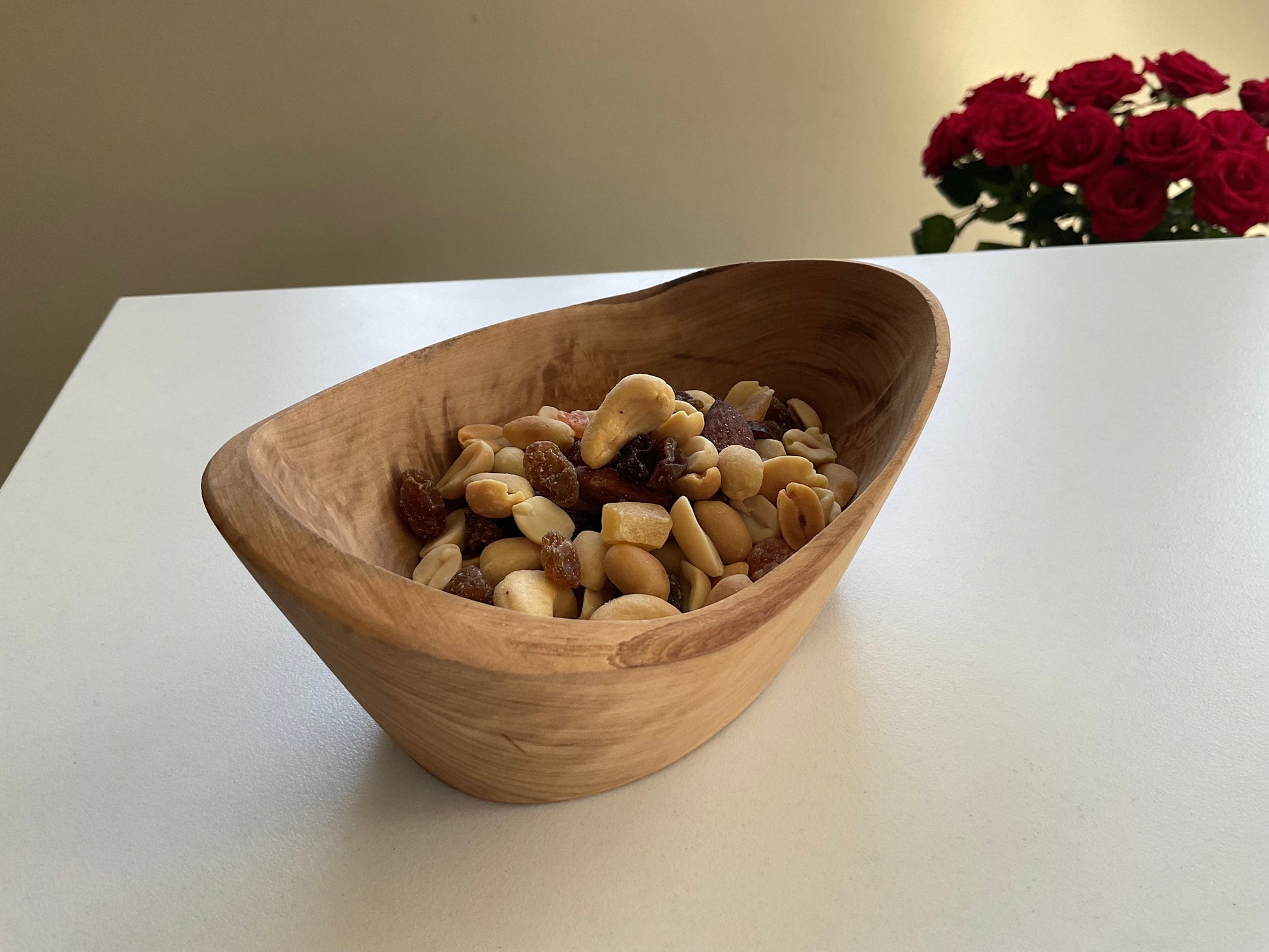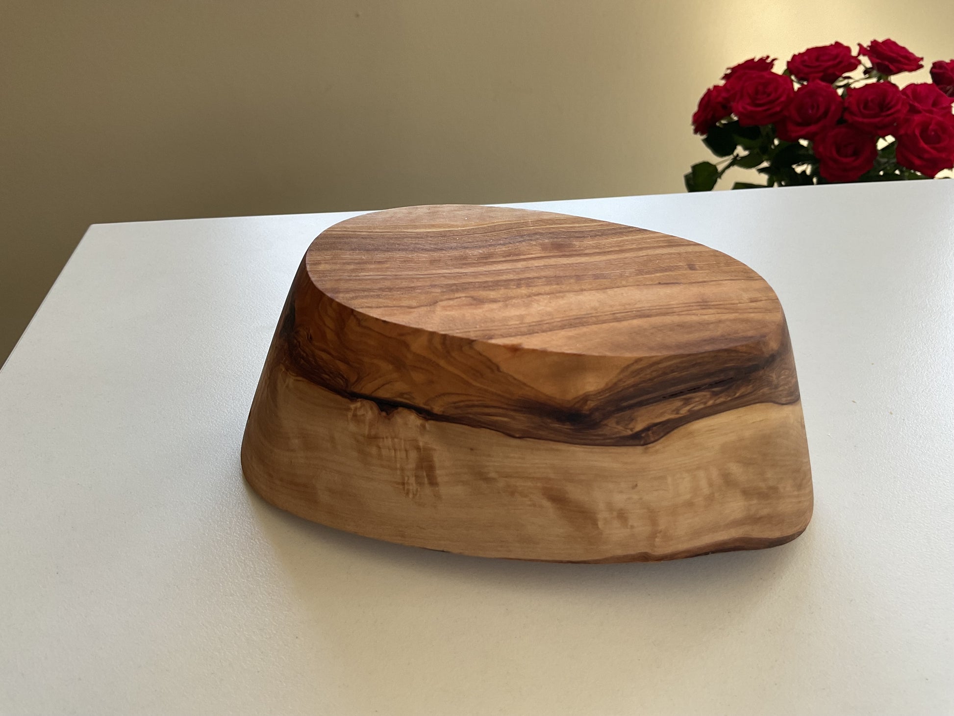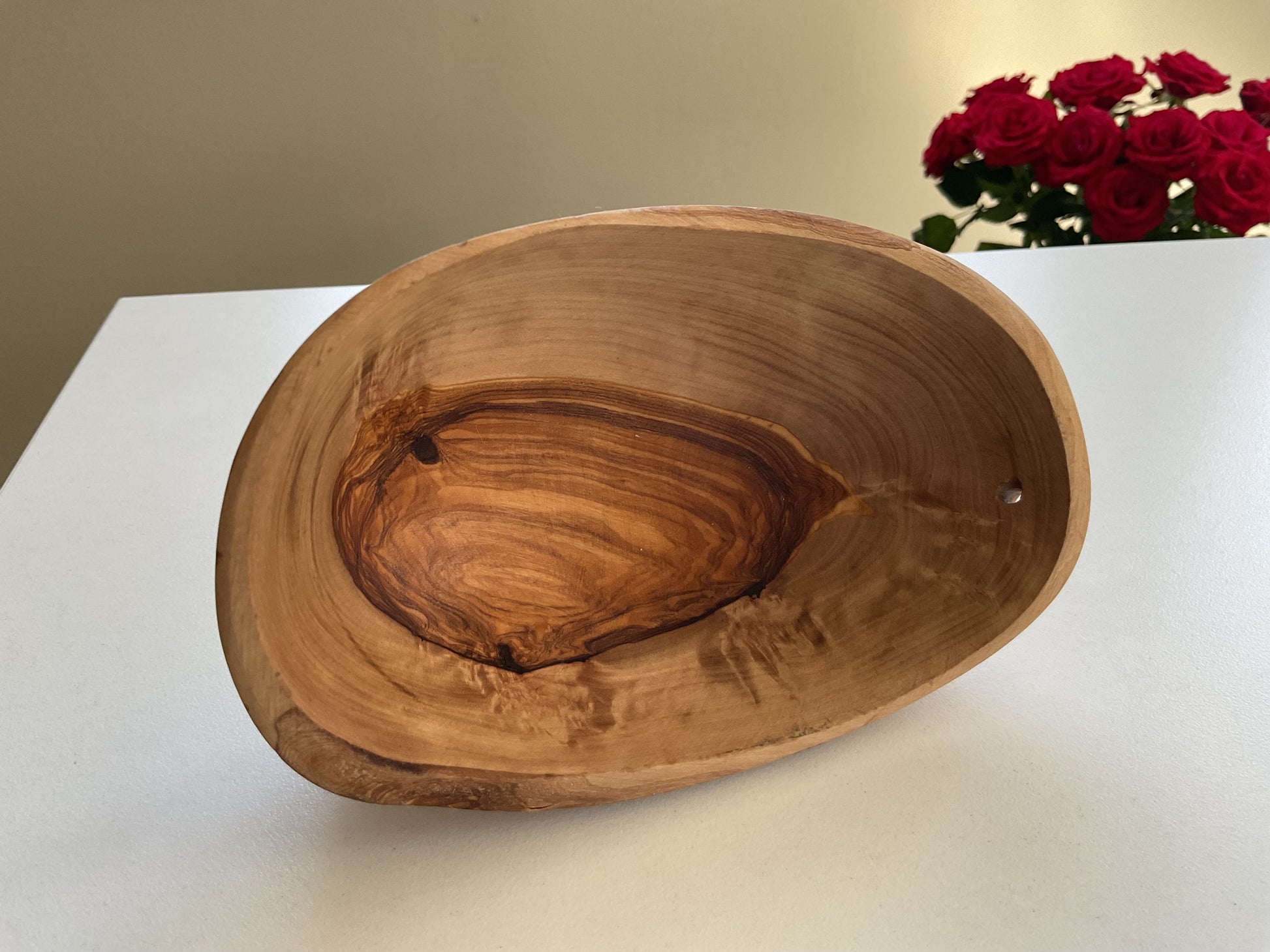 Skål i ekte oliventre, med vakre årringer og varm glød. Den ovale formen gjør den perfekt til småretter, nøtter, oliven eller som et dekorativt element i hjemmet. Hver skål er unik – formet av naturen selv og ferdigstilt med omtanke.