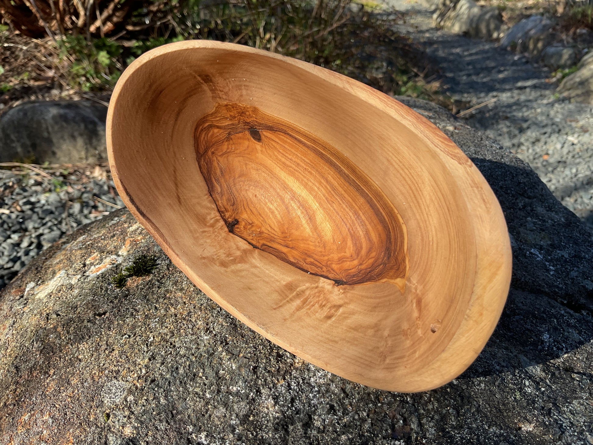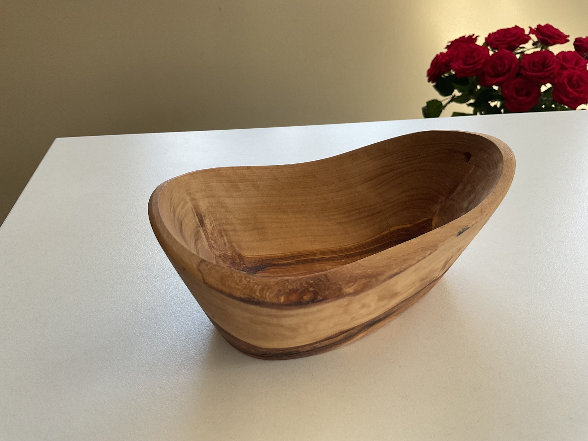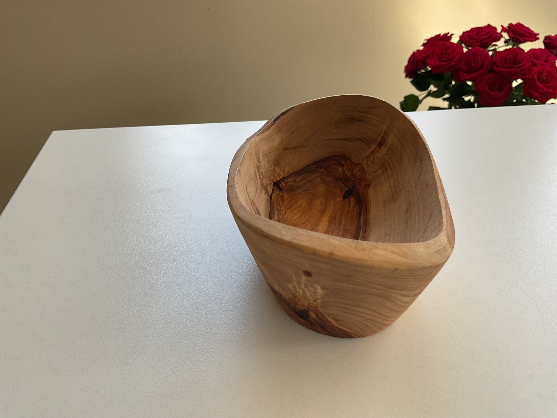 Skål i ekte oliventre, med vakre årringer og varm glød. Den ovale formen gjør den perfekt til småretter, nøtter, oliven eller som et dekorativt element i hjemmet. Hver skål er unik – formet av naturen selv og ferdigstilt med omtanke.